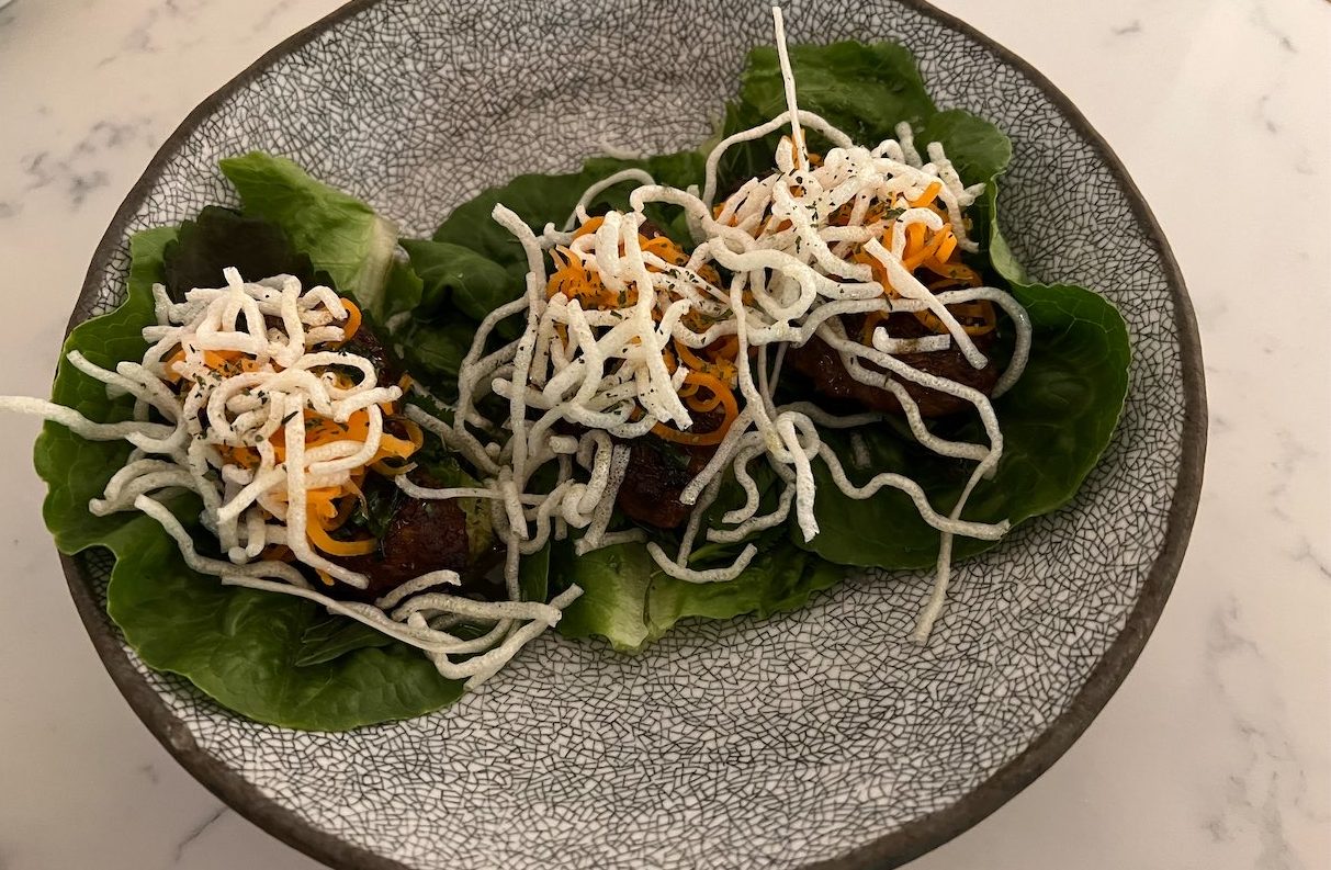 Our next dish was the Char Siu, created with a marvellously marbled pork neck. The black bean and burnt scallion elements added depth of flavour ($45). We enjoyed it with a lovely looking and tasty iceberg salad. XO does iceberg total justice, with a Yuzu vinaigrette, dried mix seasoning and egg yolk ($18).