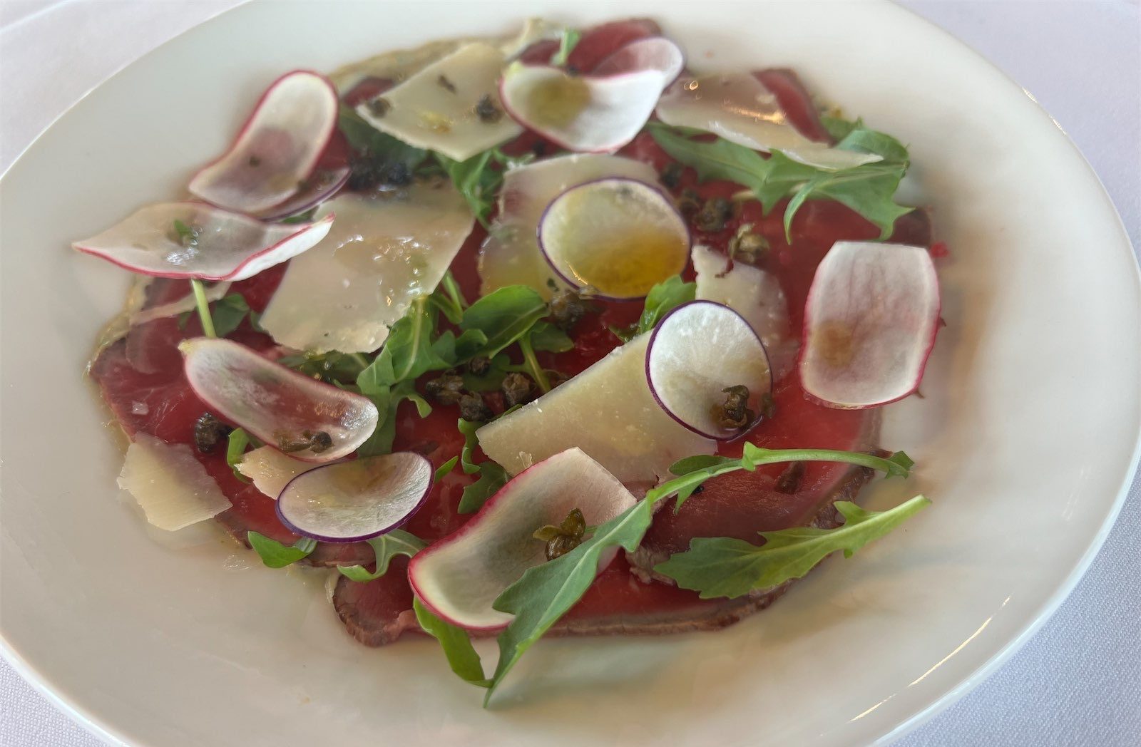 I ordered the superb smoked fillet of beef tonnato. I was drawn to the crispy capers and finger limes, which I adore. The sauce was well-balanced and thin slices of red and purple radish and rocket adorned the dish. The shaved, aged parmesan rounded out the flavour profile.