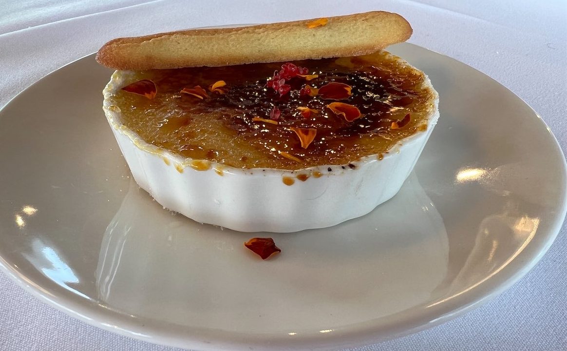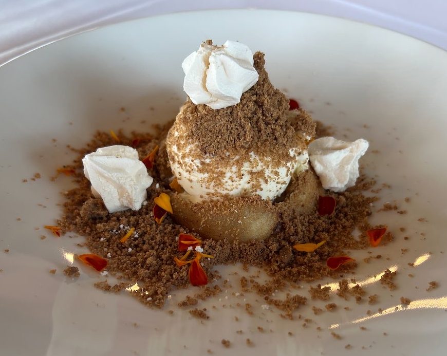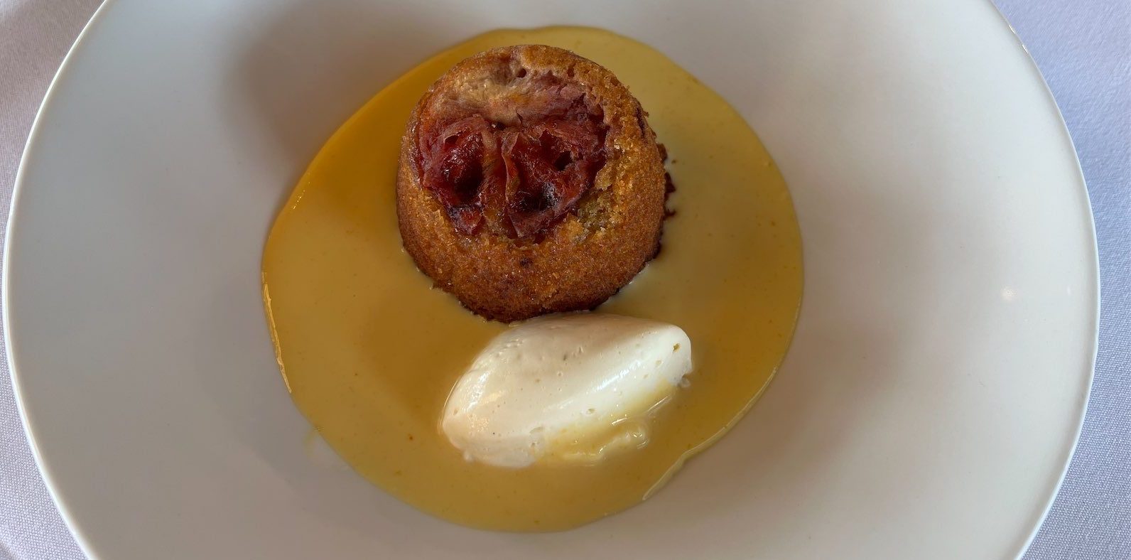 Mains hit the spot, especially the herb-crusted lamb backstrap, juicy and tender. On the side was a traditional French pithivier (enclosed pie). The Sicilian caponata was bold and the labneh thick and creamy. The bit of basil oil poured on top was gorgeous.