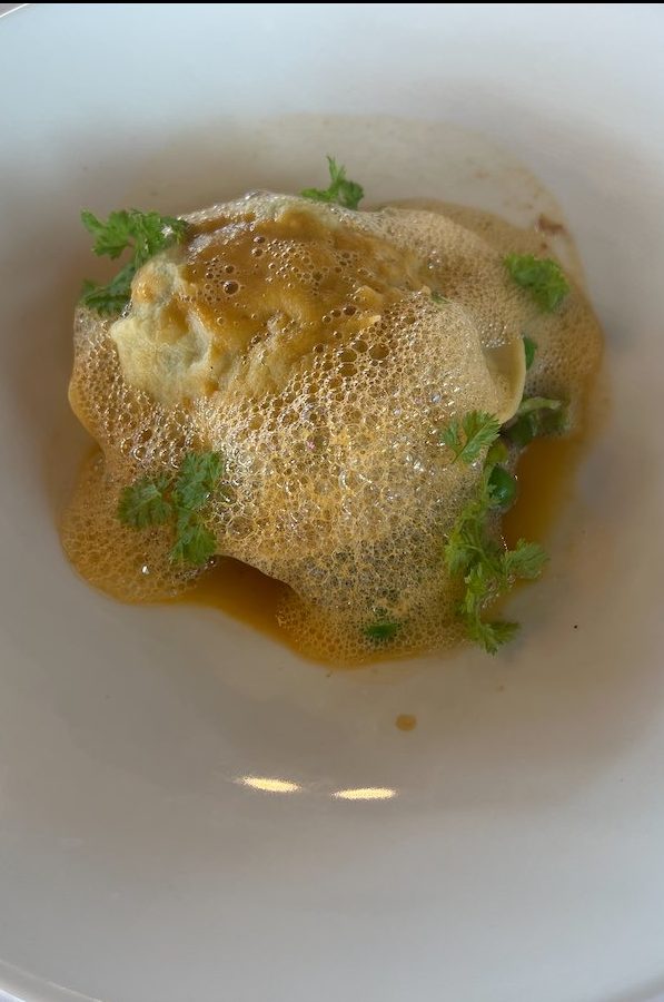 The lobster bisque entrée (an additional $6) looked pretty on the plate, with the large ravioli stuffed with lobster tail. It was perched on French petite peas. One of our party felt the bisque wasn’t intense enough.