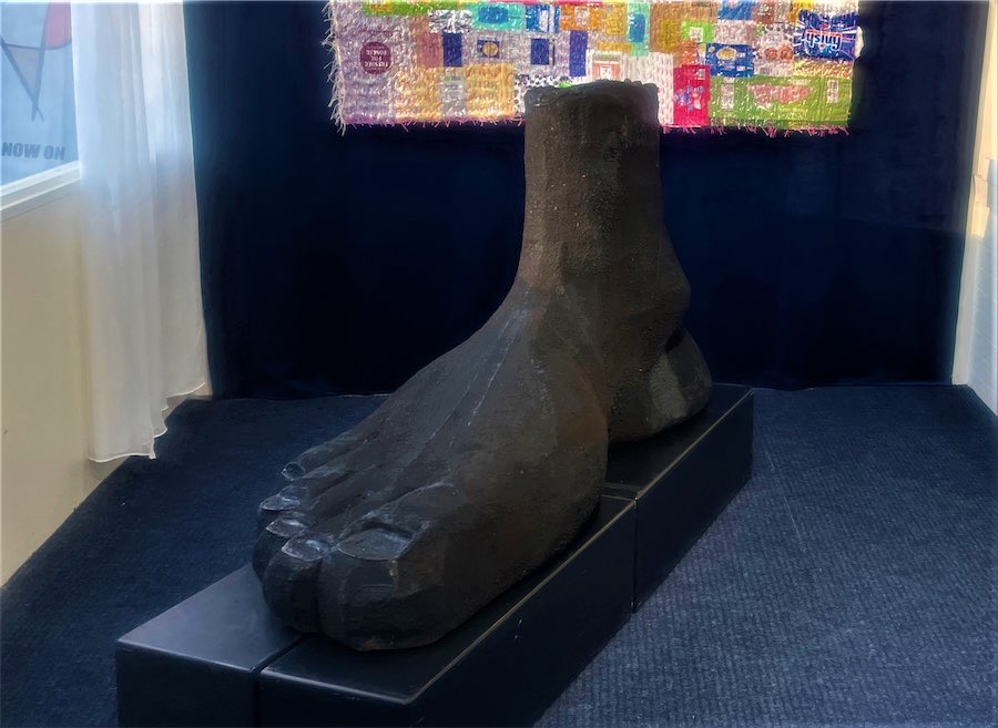 Setting subtlety aside, there’s no mistaking the meaning of the show’s piece de resistance, “Big Foot”, a huge papier mâché foot coated with carbon and coal dust by Ben Laycock and Rilka Laycock-Walsh. The meaning is plain and the carbon footprint is large indeed.