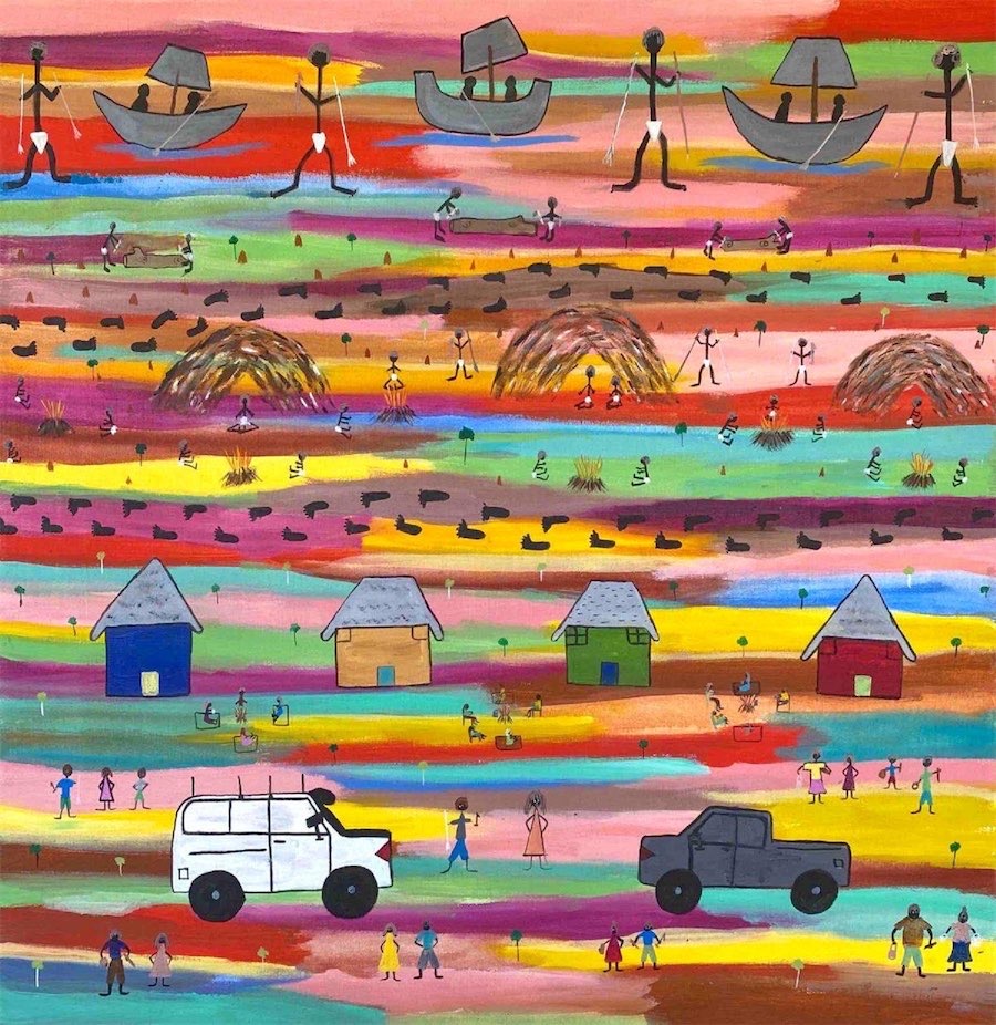On one wall is a series of joyous naive paintings, “Longtaim Ti Didei” (Long Time Till Today), by Karen Rogers, embellished with captions in the Kriol language of her community.