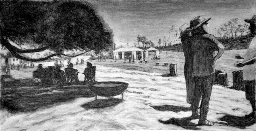 But Stephens is fascinated by First Nations entries that struck him as more naturalistic, like “Bottle Tree Country Dreamtime”, by Andrew Nelson, depicting a time before colonisation and land clearing in south-western Queensland and “Mannalargenna Day”, a charcoal drawing by Louise Daniels, depicting an annual celebration held on country in Tebrakunna, north-eastern Tasmania.