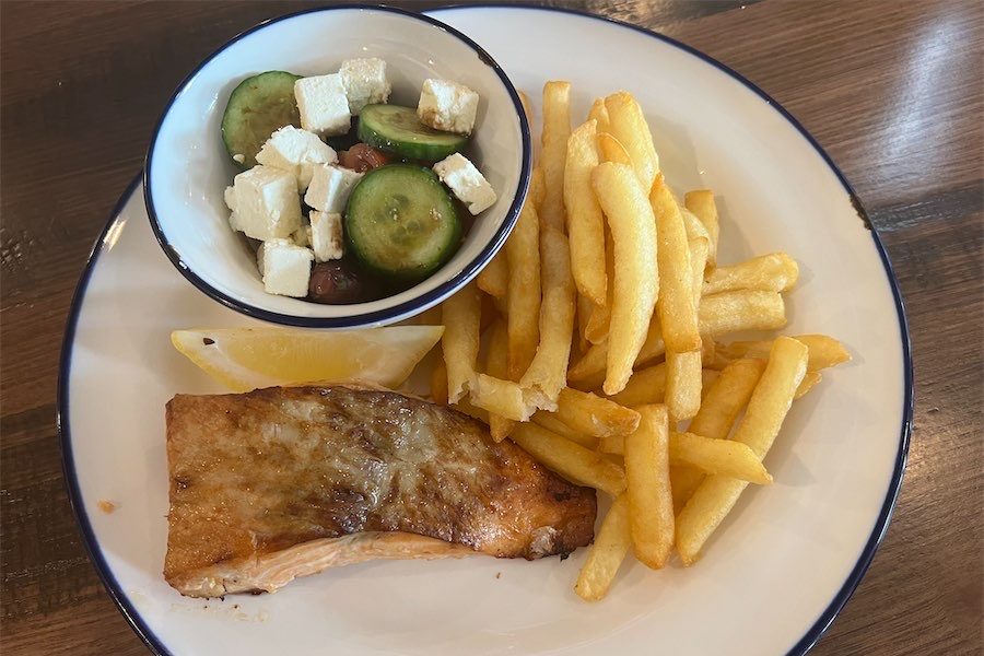 One of our party ordered the Tassie salmon (180 grams) with a small side of Greek salad (tossed salad is another option) ($29). She thought the fish was lovely and super moist.