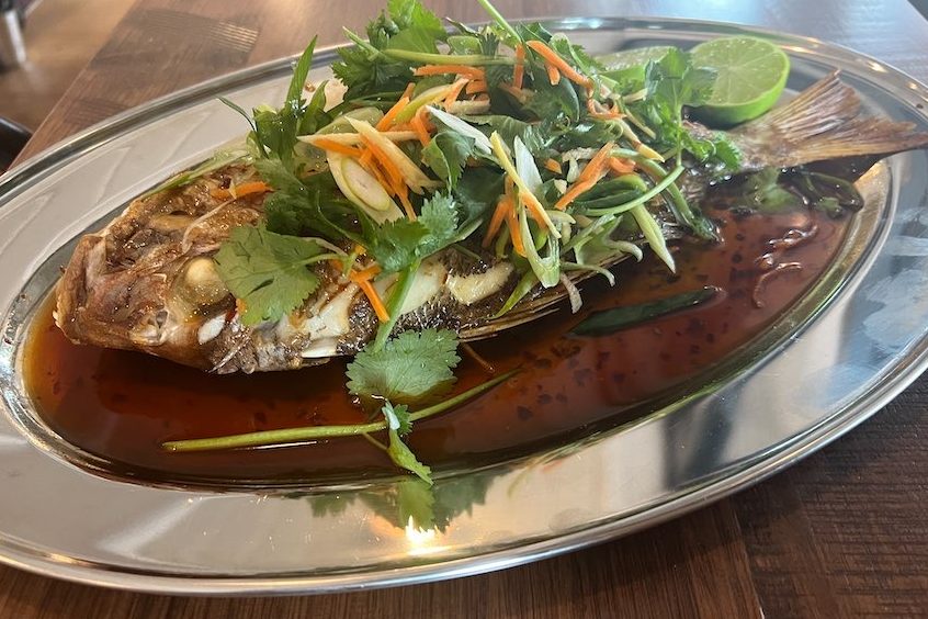 It was sharing time for two who were lunching with us, with the Asian-style, baked, whole baby snapper large enough to fill both tummies ($39). The dish featured chilli (not super-hot but definitely with kick) and a blend of fresh lime, ginger, soy and garlic. It took ages for the dish to arrive.
