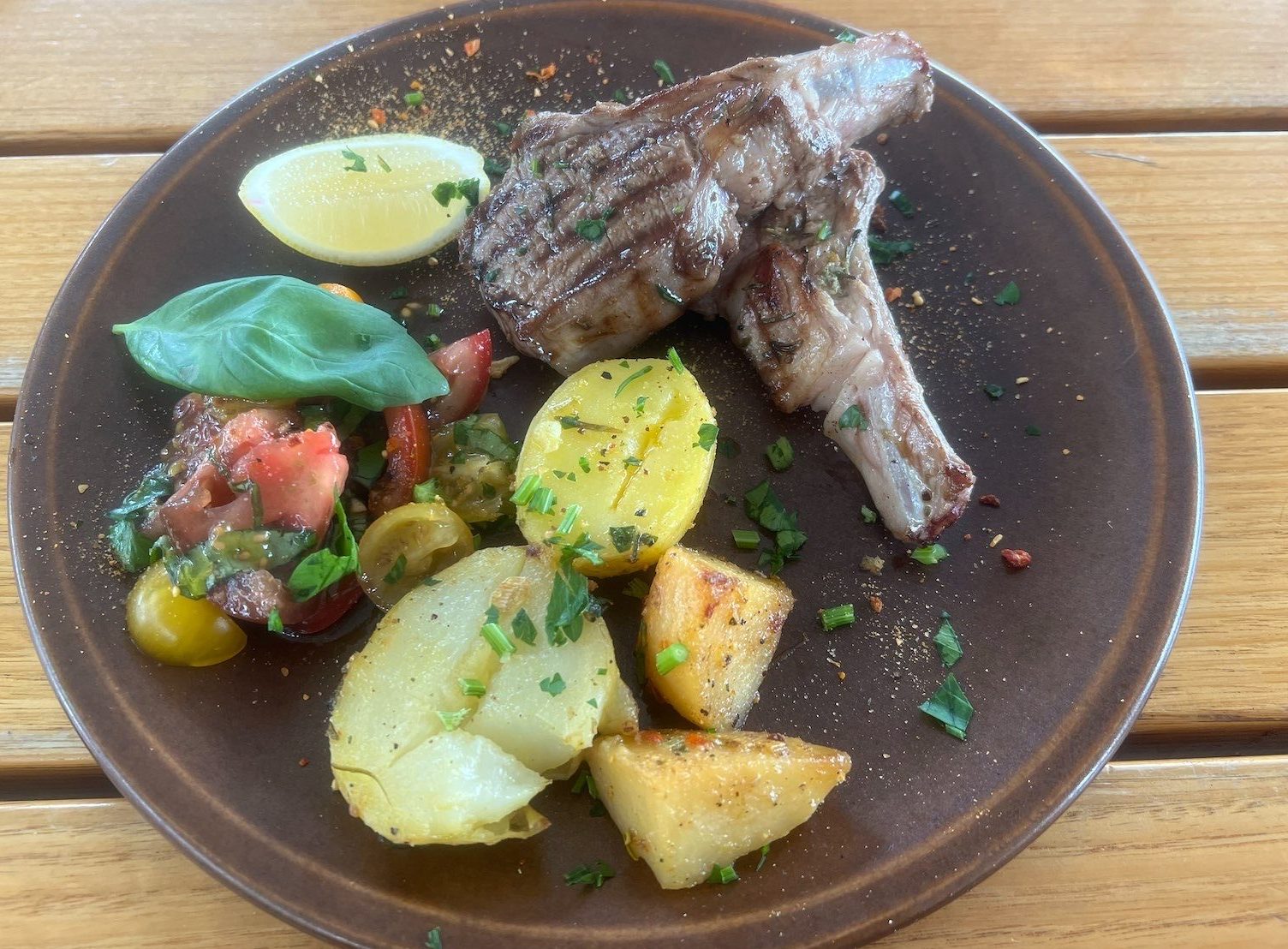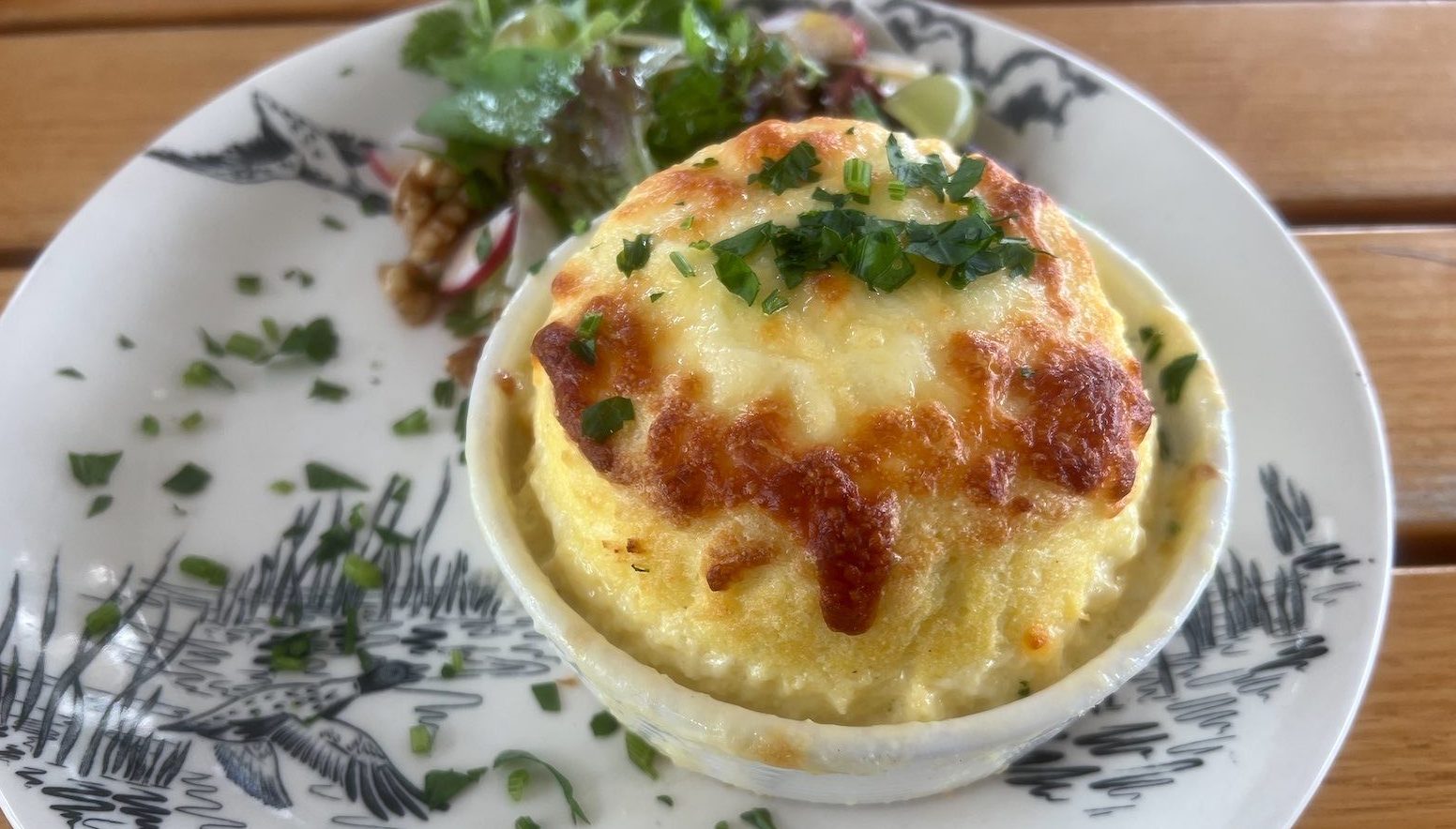 With mains, the two lamb cutlets were cooked perfectly pink and arrived with creamy new potatoes and a medley of tomato salad ($33). The cutlets were marinated with garlic and herbs before being grilled. The twice-baked soufflé was a stand-out, created with sharp cheddar and gruyère ($25). A small, fresh white grape, walnut and parmesan side salad rounded out the dish.