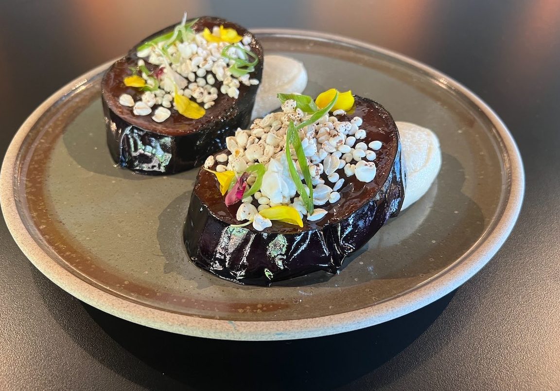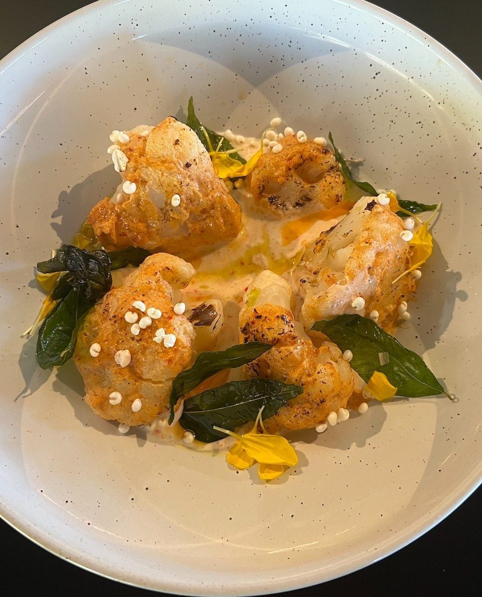 The miso eggplant with puffed grains was mighty fine and a perfect texture, given this veggie can be tricky to cook at times ($16). The satay roasted cauliflower commanded our attention and the nut praline was crazy fun ($15).