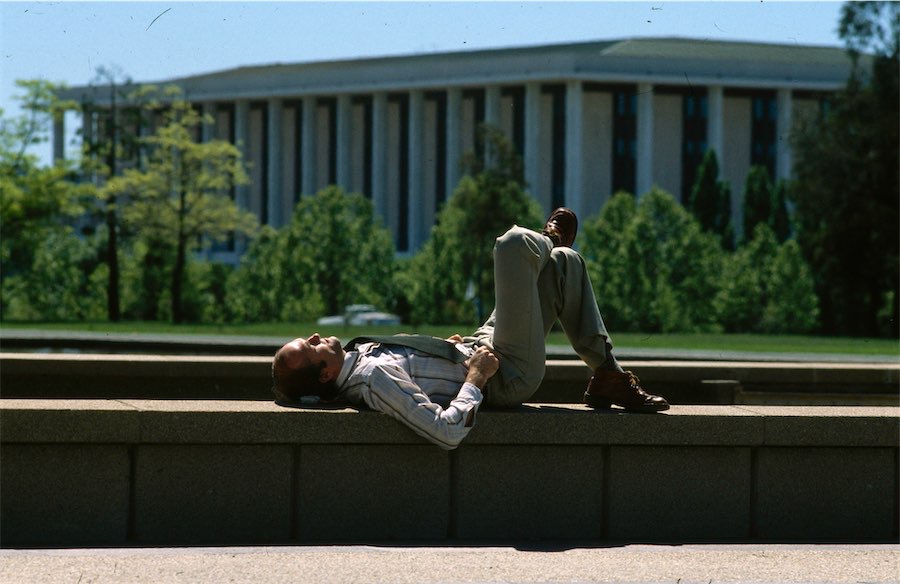 Some are celebratory images, such as Eric Wadsworth’s pictures of revellers enjoying the rides at the Moomba Festival in 1986 or Norman Plant’s photograph of dancers performing at the 1987 Canberra Festival, but others are more ordinary and relaxed, such as John Houldsworth’s shot of an unnamed Canberran taking a lunchtime nap in the Parliamentary Triangle in 1981.