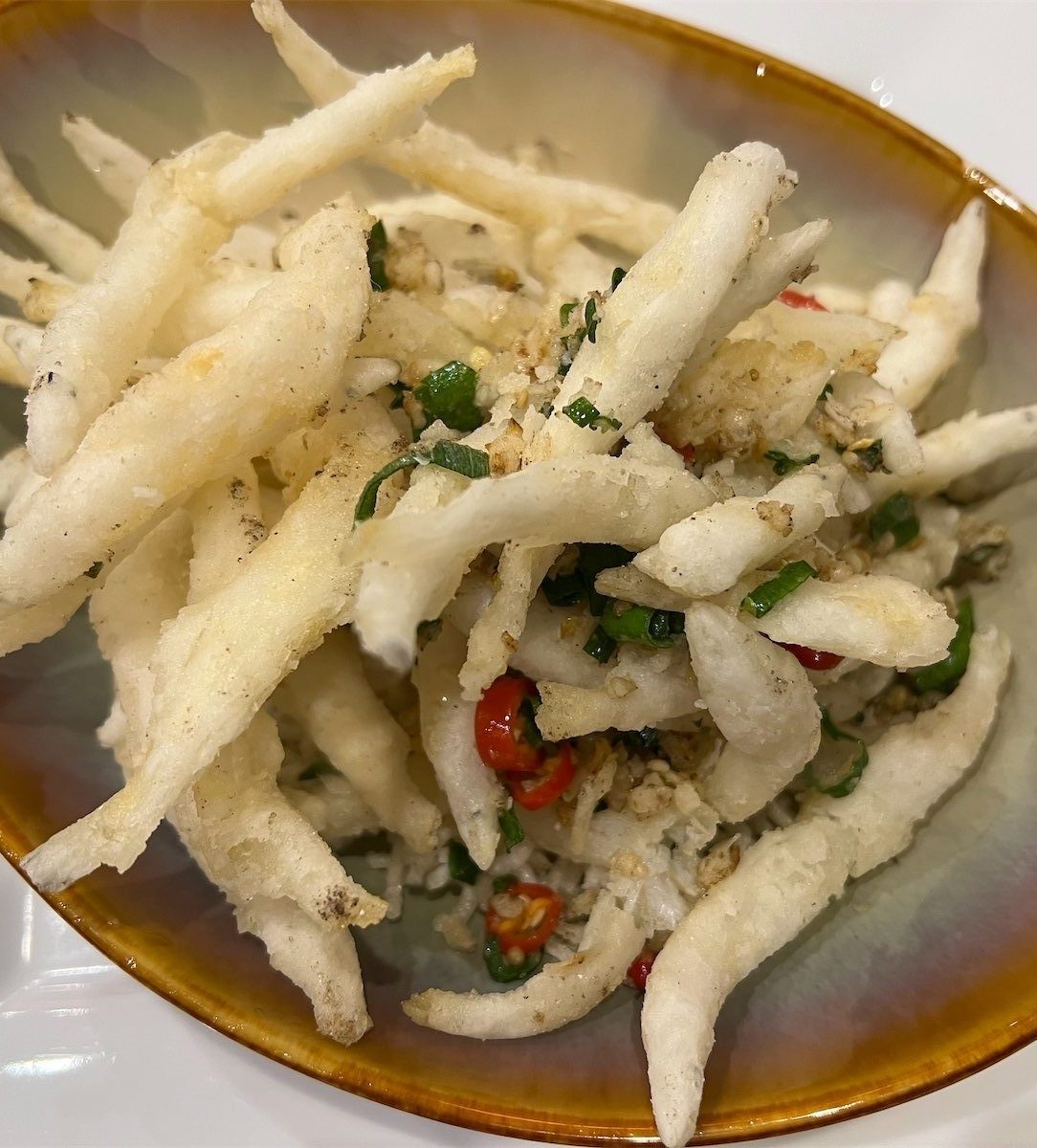 An excellent choice is whitebait with hot rock salt, with the fish dipped in a fine coating, lightly fried and seasoned perfectly ($27). The mound of fish arrived on top of a bed of crispy noodles.