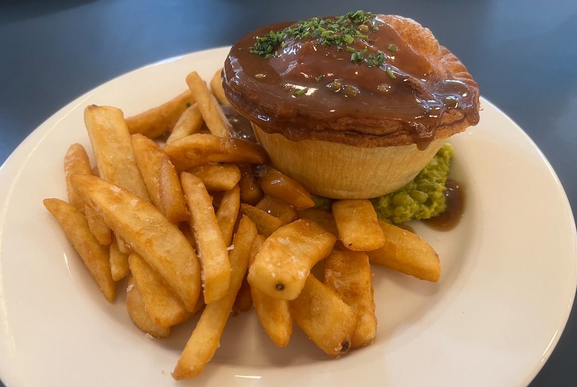 Mains were just as delish. The in-house-made meat pie was loaded with chunky beef encased in flaky pastry and smothered with gravy. The mound of mushy peas and the chips hit the spot ($22). Good to see this classic pub dish taken to new heights.