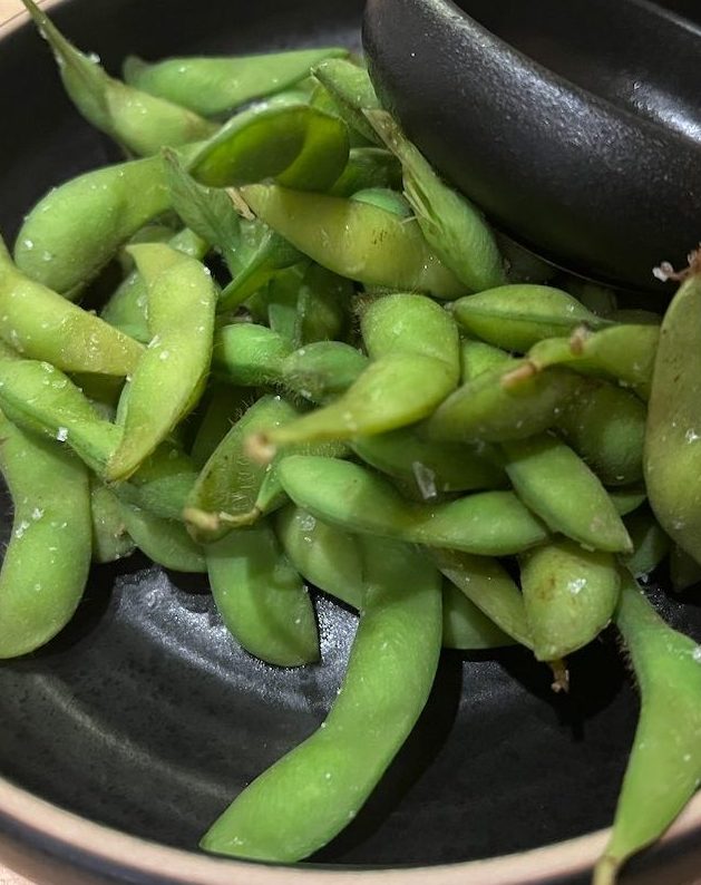 With the crisp, fresh 2021 Golden Child Fume Blanc (Adelaide Hills, $62/bottle) we tantalised our tastebuds with steamed soybeans ($7). The warm edamame was tossed with lovely, flavoured salts.