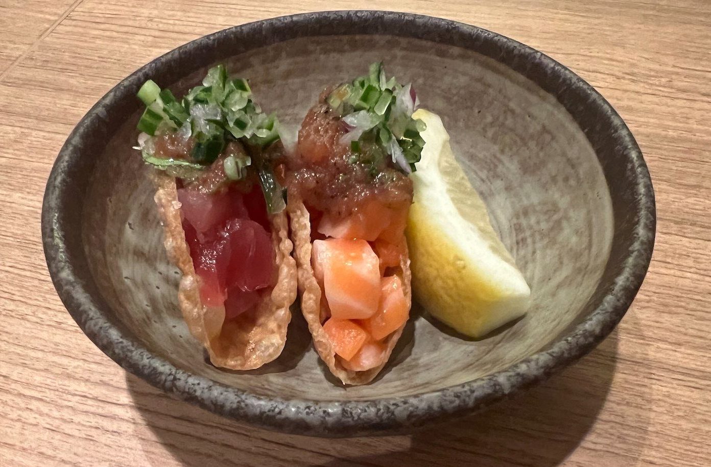 The sashimi tacos were perky and fun (two pieces for $12), and the carefully diced tuna and salmon sashimi testament to the high-quality produce Inari worships. The taco shells were crisp and the chilled tomato and jalapeno salsa danced.