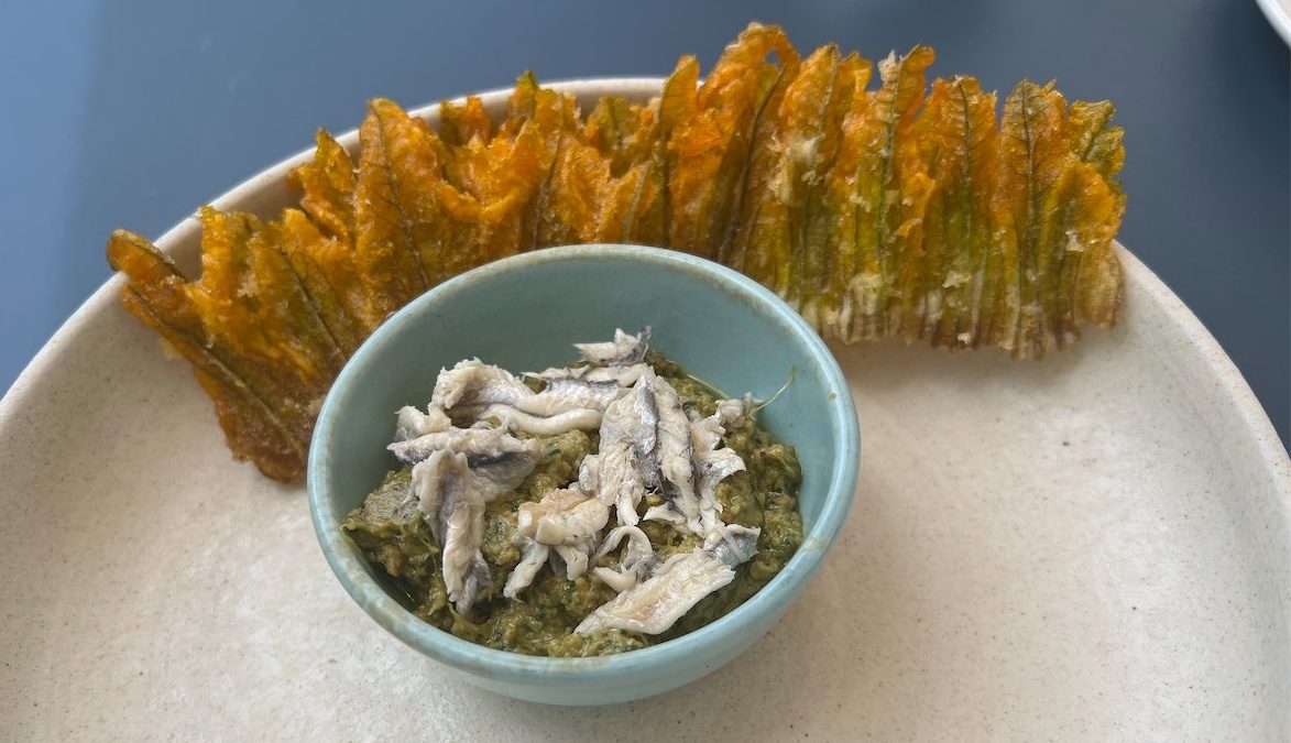Don’t pass by the stunning zucchini flowers, lovely and crunchy and balanced with Sicilian-inspired salsa agresto, and salty white anchovies ($11 each).