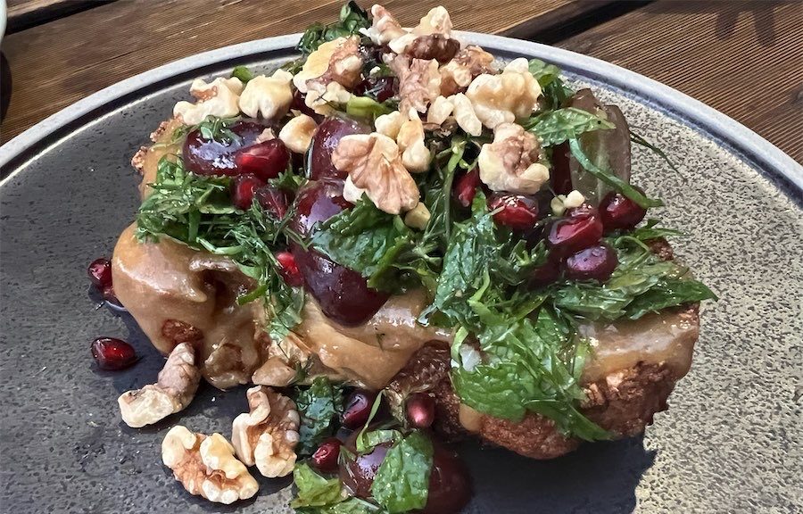 We also shared cauliflower steak, a popular dish on many menus these days. Rosemary’s version was yum. It features caramelised tahini, mixed herbs, grapes, dukkah, walnuts for crunch, and a pomegranate molasses dressing ($26). If it all sounds a bit much, don’t fret. The combination of textures, flavours and ingredients is magic.