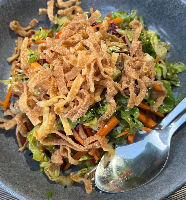 Sides include an innovative green salad with loads of fried wonton pieces perched on top. It’s a super fun, delicious salad and the special dressing added life to the fresh lettuce leaves. The salad was finished off with sesame seeds.