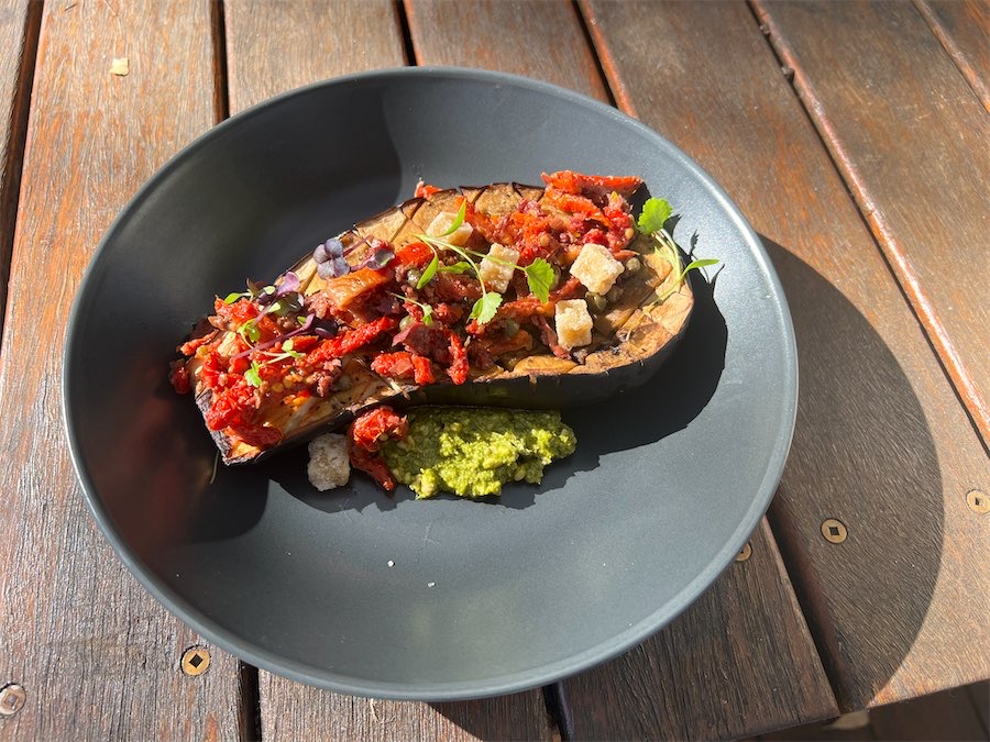 The whopping half-an-eggplant was deep-fried and loaded with chopped olive, baby capers and sun-dried tomato. It came with coconut yoghurt ($21) and could easily have been a main.