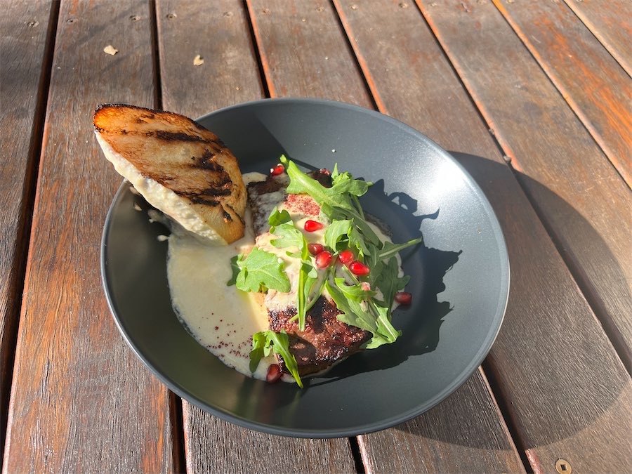 I’m a fan of pork ribs and these Jerk barbecue ones were nice and sticky, with the meat falling off the bone ($39). The lamb backstrap arrived in a pool of ajo blanco (a cold Spanish soup), pretty pomegranate seeds, fresh rocket and a slice of toasted bread.