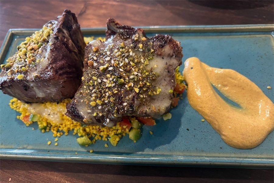 For mains we could not go by the authentic Greek lamb chops, lusciously thick and beautifully pink with perky pistachios on top for texture ($34). They were served on a superior, fresh cous-cous salad with tomatoes, and we dipped the lamb in the accompanying smear of saffron-infused spiced yoghurt with gusto.
