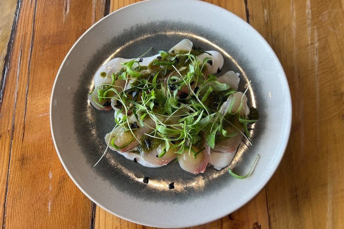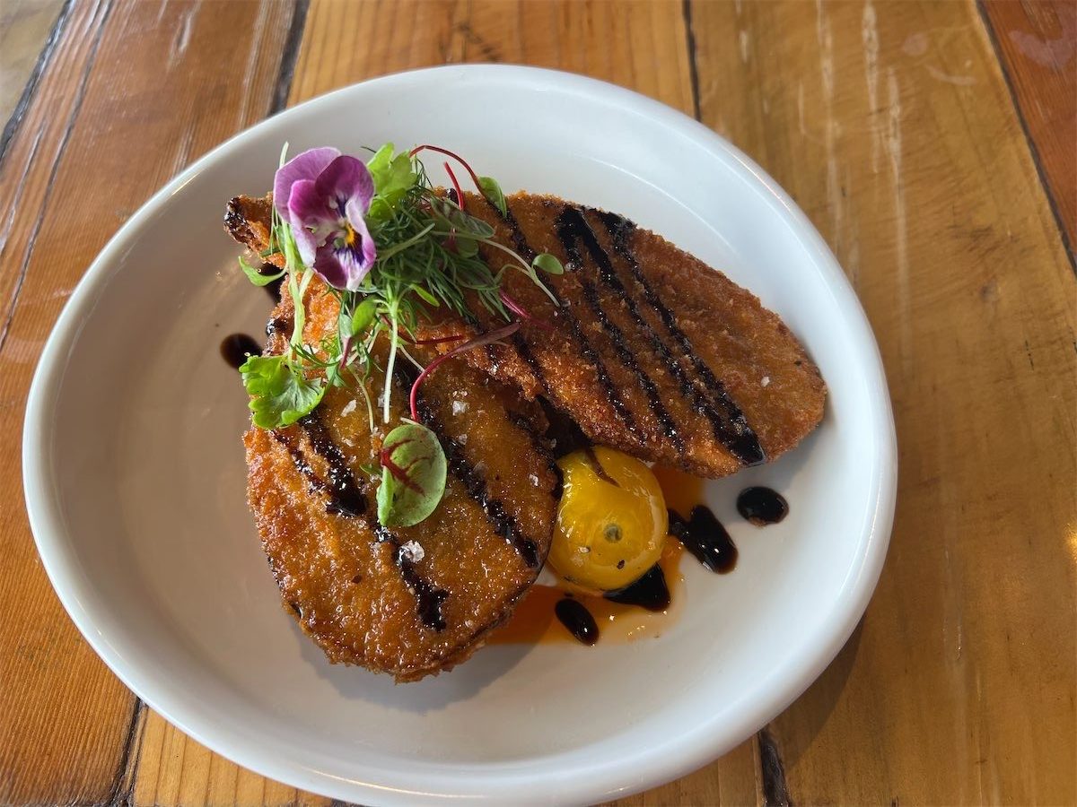 Another winner is the breaded eggplant with creamy skordalia, a slightly spicy bois boudran sauce, more of those punchy tomatoes and a micro herb salad. Basil oil rounds matters out.
