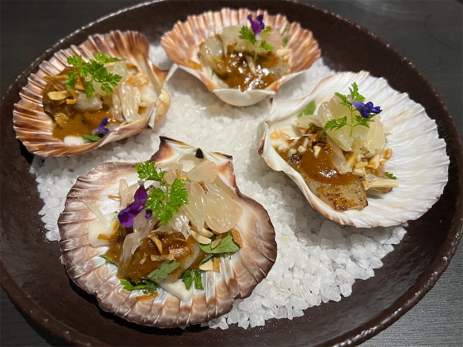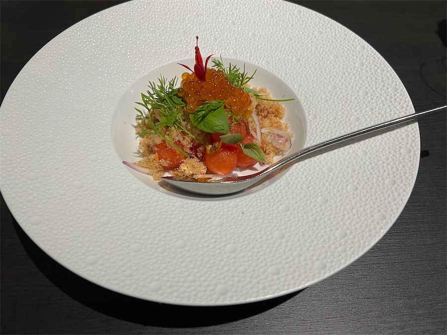 The watermelon salad, a signature dish from Bangkok, was a plate of perfection. It was created with ground salmon, fried shallots, and Huon River trout caviar. Equally gorgeous were scallops with lychee (so fresh on the palette), sea urchin and young coconut.