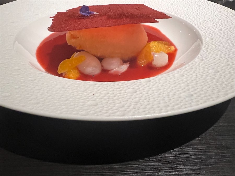 Our fresh sorbet – a grand finale – was a piece of art, painted with ruby red and orange colours.
