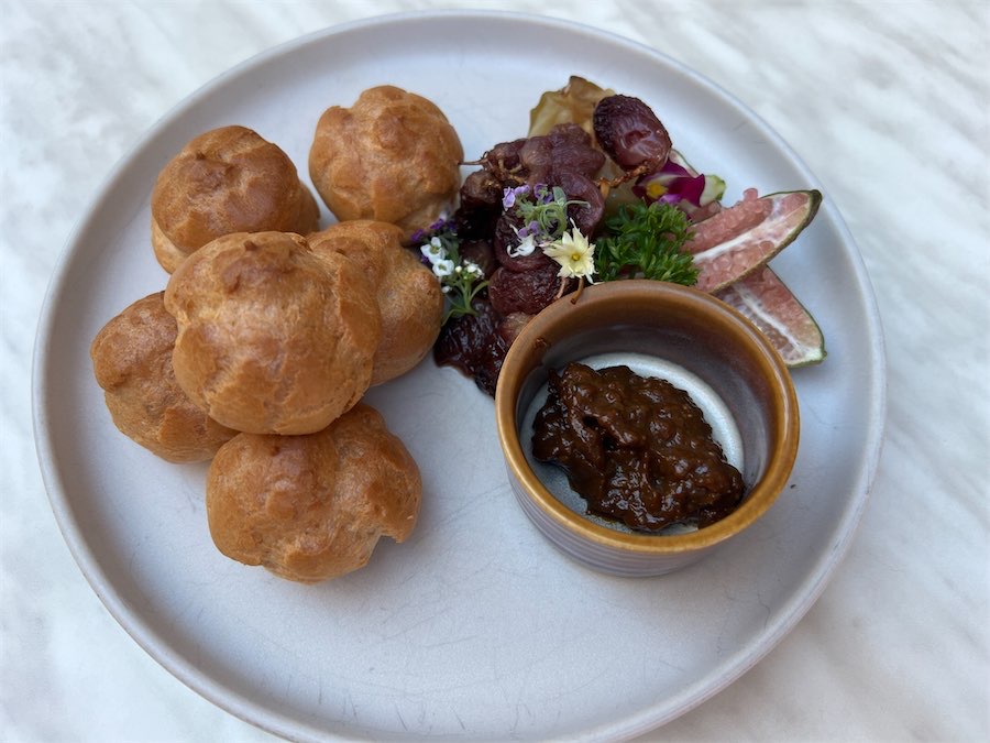 We were intrigued with the rabbit and quail profiteroles, served with crème fraiche and Vandouvan quince ($20). They were fun and delicious. Another delightful share plate was the juicy, earthy Portobello mushrooms ($22).