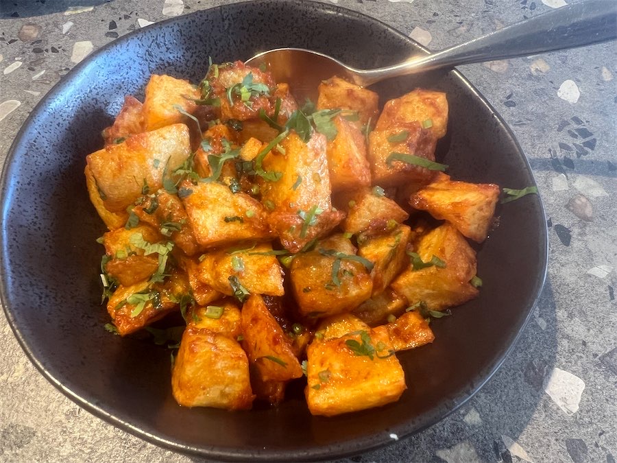 Accompanying our sausages was the Potato Harra dish ($24). Piping hot, the fried potato cubes were soul-satisfying. The potato was mixed with coriander, garlic (not overpowering), chilli (nicely balanced) and loads of zesty lemon juice, another vegetarian celebration.