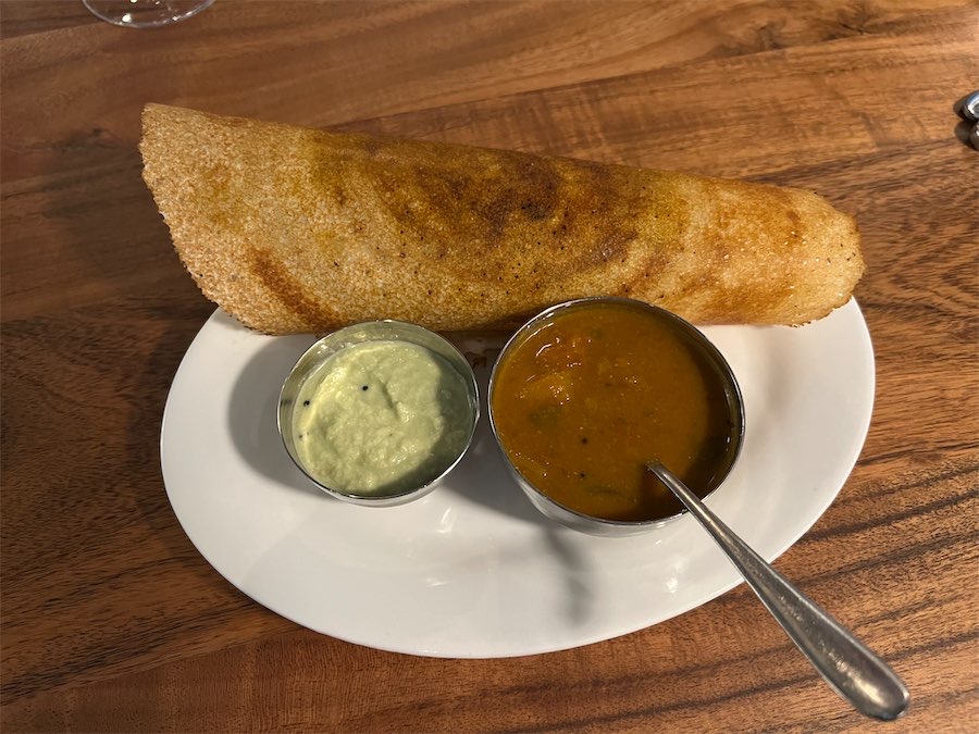 A house speciality is the dosai and we ordered ours with a spiced ground lama masala filling (mini size $13 and regular $26). The crepe was slightly crispy and wonderfully thin. It was served hot with two dips, one cooler than the other. We were encouraged to dip our dosai into both before indulging, which we did, appreciating the advice.