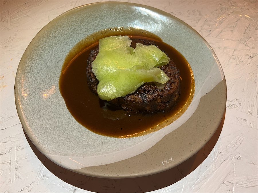 Also from the “large” section of the menu, we ordered the braised pork neck, also melt-in-the-mouth. This was with rich black garlic and a smoky chipotle ($42). On top were fresh thin slices of green melon.