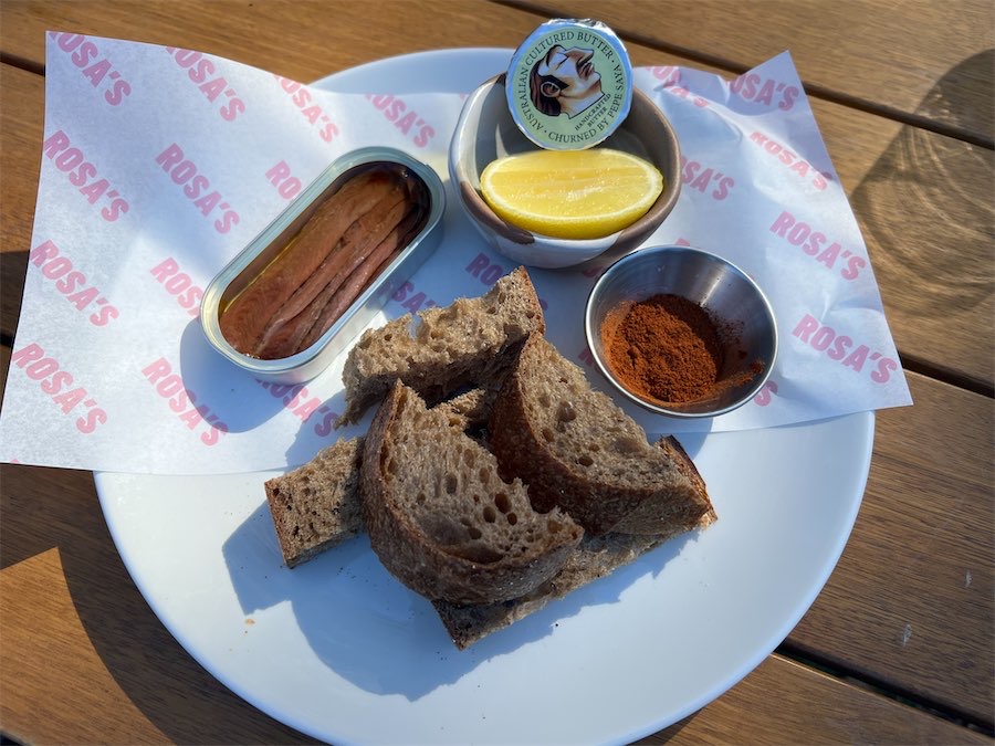 To tantalise our tastebuds we kickstarted with quality, intense, briny Ortiz anchovies with sourdough, loving that Rosa’s provides a thick wedge of fresh lemon and a small side dish of chilli powder to perk matters up ($26, but worth every bite).