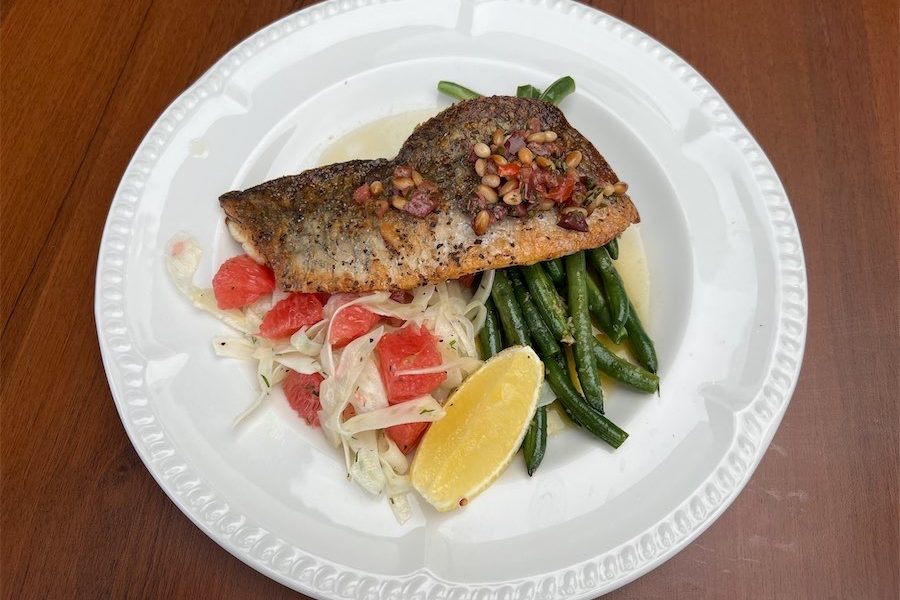 Early Edition puts effort into presentation, and the effort is appreciated. The pan-roasted fillet (a lovely portion) was placed to the side and partially on a serving of sauteed beans (not overcooked). Nicely arranged was the bright-looking fennel citrus salad featuring punchy segments of a ruby red grapefruit. Decorating the fish was a scoop of pine nuts, finely chopped tomato and olive salsa, a welcoming salty element.