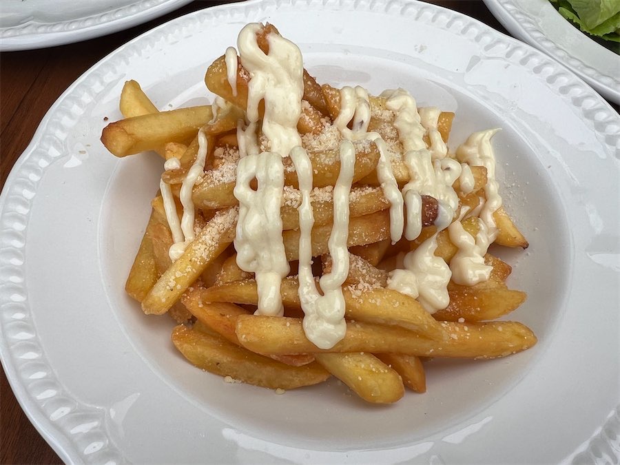 We shared an attractive side salad ($15) with loads of avo, cucumber, baby cos and a welcoming, well-balanced vinaigrette. The fries with parmesan and aioli were piping hot ($9), although next time we’ll ask for the aioli on the side instead of squirted all over the top.