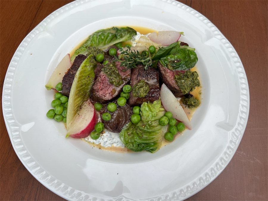 My friend enjoyed her wine-glazed lamb backstrap ($36), medium rare, consistently sliced and carefully arranged on creamy labneh with vibrant mint. Crunchy red radish added zip. Peas, leaves of gem lettuce and salsa verde added gorgeous colour.