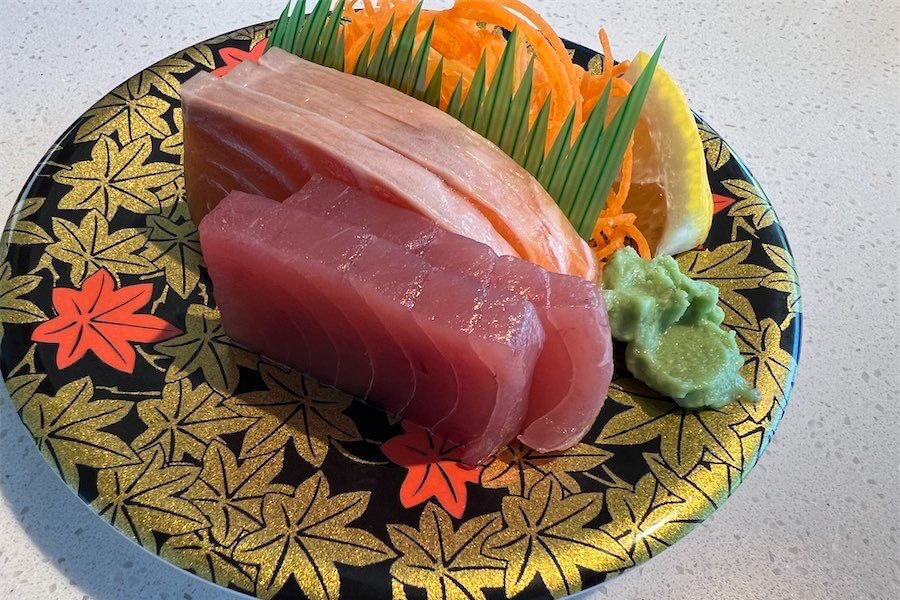 The sushi train at Taiwa Sushi slowly moves dish after dish after dish along a super-long conveyor belt that winds through the restaurant, directly in front of most seats.