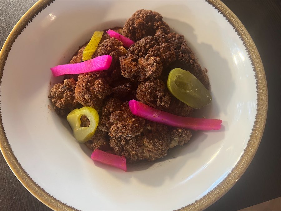 From the menu’s large, shared-plates section, we opted for the “golden cauliflower” ($34), 100 per cent proof that vegetarian dishes can be anything but boring. The head of cauliflower is roasted until it’s dark golden in colour, which contrasts beautifully with the slices of the bright pink and green pickles placed on top. The dollop of goat’s curd adds creaminess, and the hit of smoked paprika takes the dish to the next level.