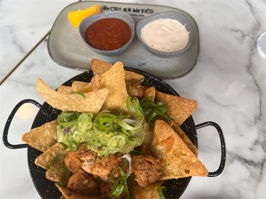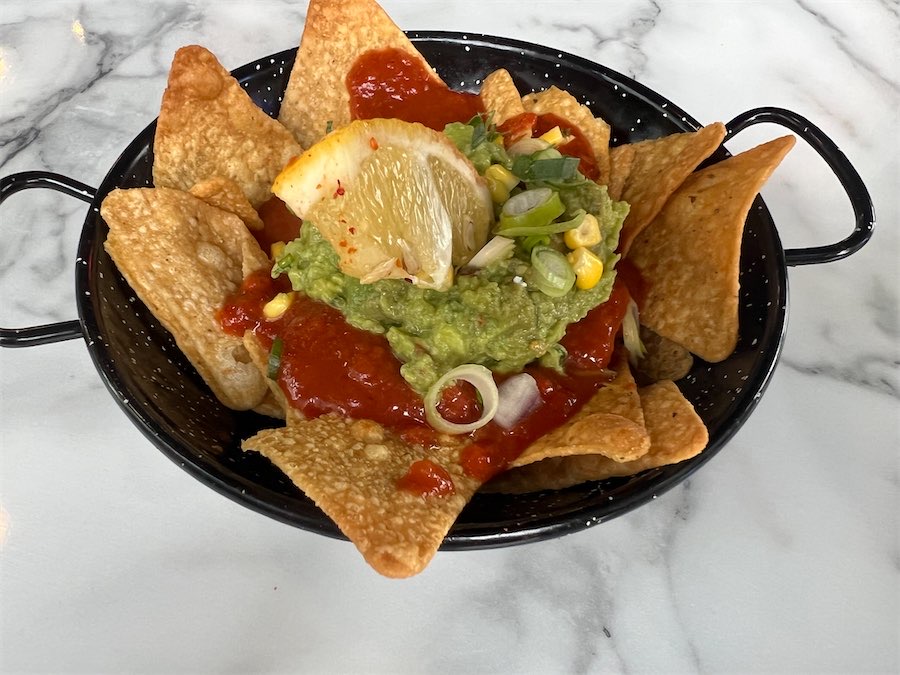 The fresh, house-made guacamole with a super salsa and white corn chips hit the spot ($13.50), as did the “mini nachos” with chunks of marinated grilled chicken ($21). The nachos were served with a wedge of lemon, and small bowls of sour cream and salsa verde.