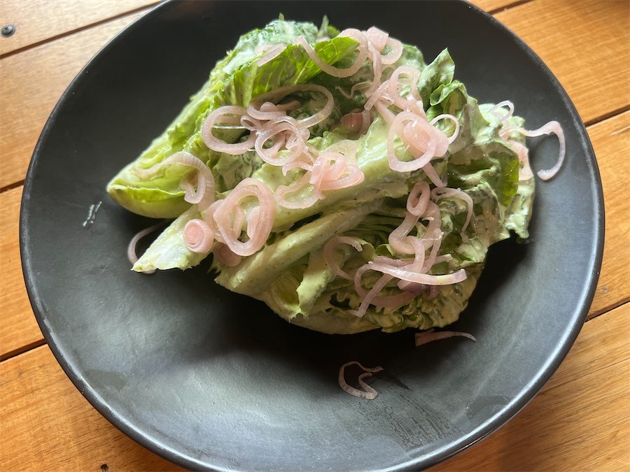 Disappointing was the baby cos lettuce salad ($18). It was not broken up, making the steak-sized slices challenging to cope with (and we weren’t given extra cutlery to slice it for sharing). The slices of pickled shallot overwhelmed the buttermilk dressing.