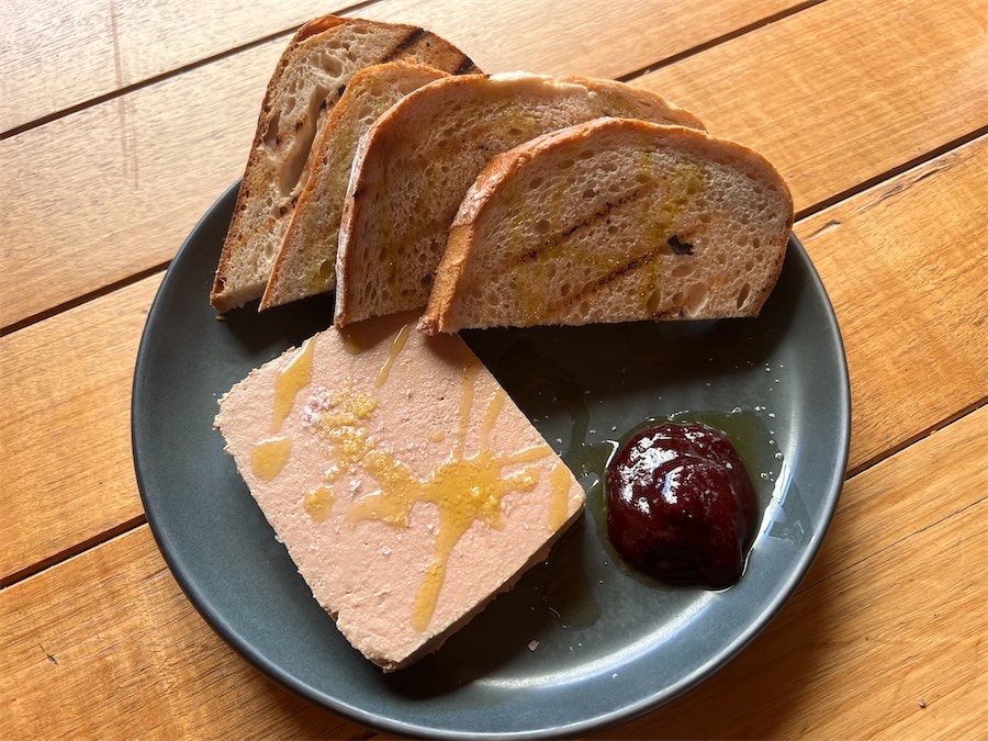A large slab of pale duck liver parfait was next, served with three slices of sourdough ($26). Thankfully, the parfait arrived with spiced plum jam, needed to elevate the taste.