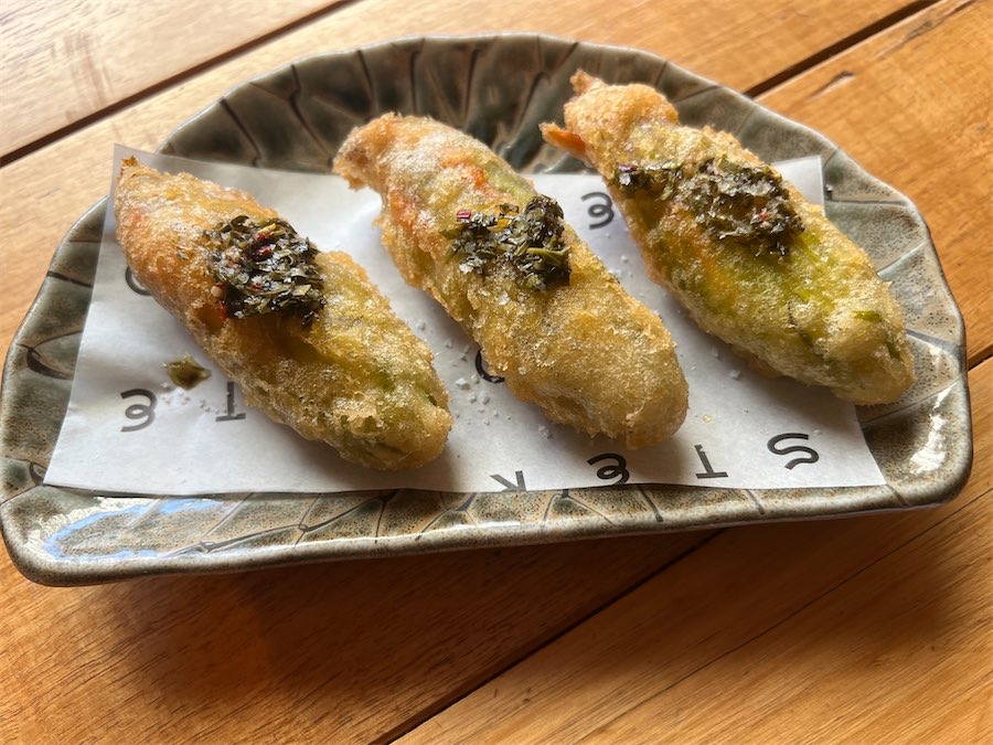 We’re big fans of zucchini flowers ($9 each). These were stuffed with semi-soft Scamorza and arrived with a spoonful of chimichurri on top. The consensus was they were too oily.