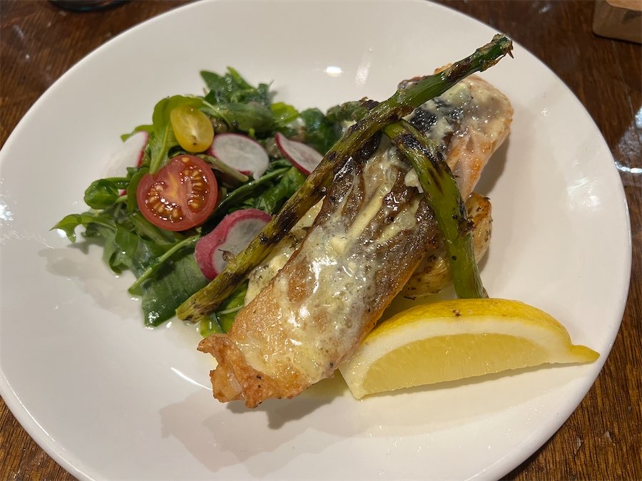 The salmon skin could have been crispier ($30). The fish came with a fresh wedge of lemon and crispy potatoes, asparagus and fresh salad rounded matters out.
