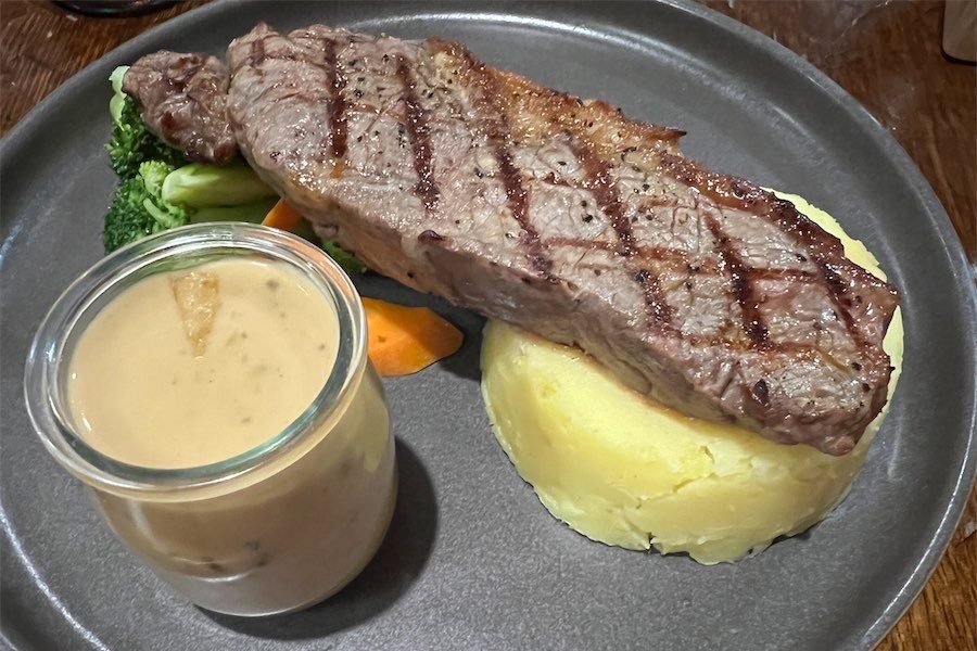 From the mains came the 200-gram New York striploin, cooked as ordered and served on a round of golden mash with veggies ($43).