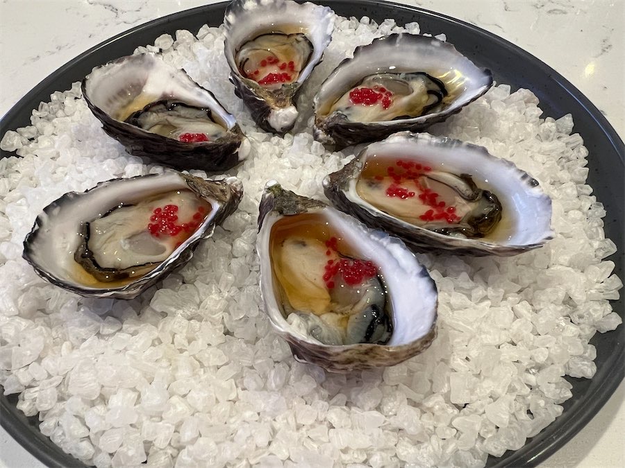Superior fresh oysters were joyous with citrusy, acidic finger lime pearls. Creamy, and at the right temperature, the oysters enjoyed a combo of bonito extract (for umami flavour) and leek oil (which we found a tad sweet; $35 for six).