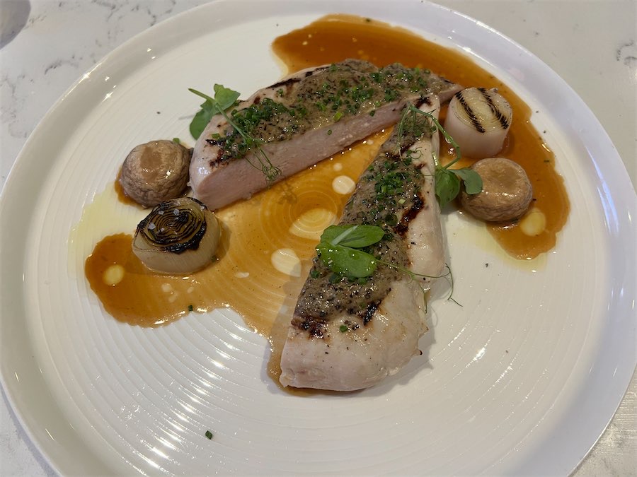 We couldn’t fault any of the mains. The poached chicken breast was soft and succulent ($36), and wonderful with miso butter, soft rounds of confit leeks, a tasty jus and pickled mushrooms.