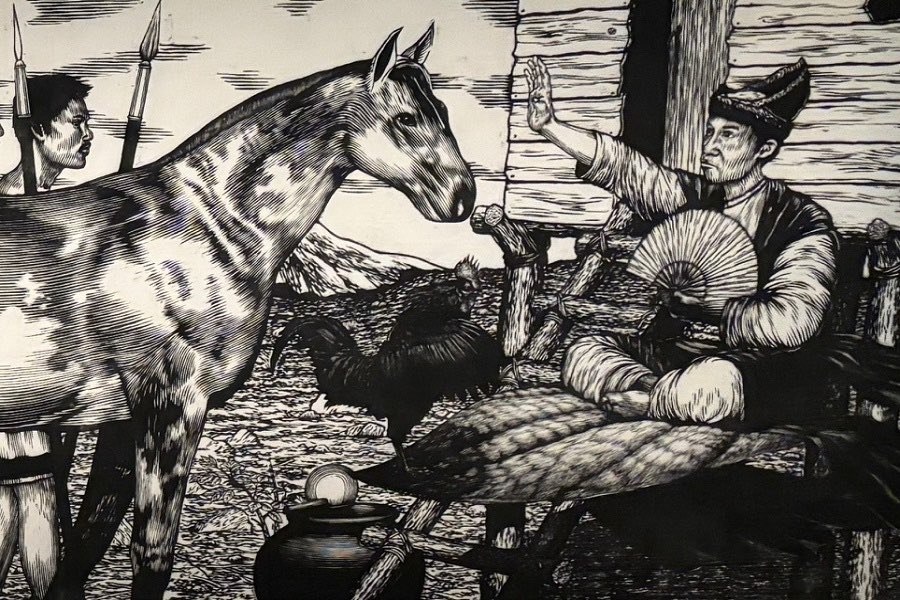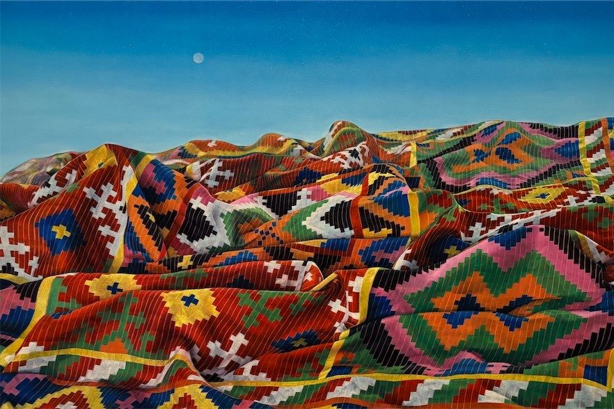 A new project, Mindanao and the Sulu Archipelago, sees works by indigenous and Islamic communities alongside paintings, video, sculpture and exquisite textile art, reinterpreted by Joel Geolamen in his two Habilan paintings, which show Tausug textiles forming mountainous landscapes.