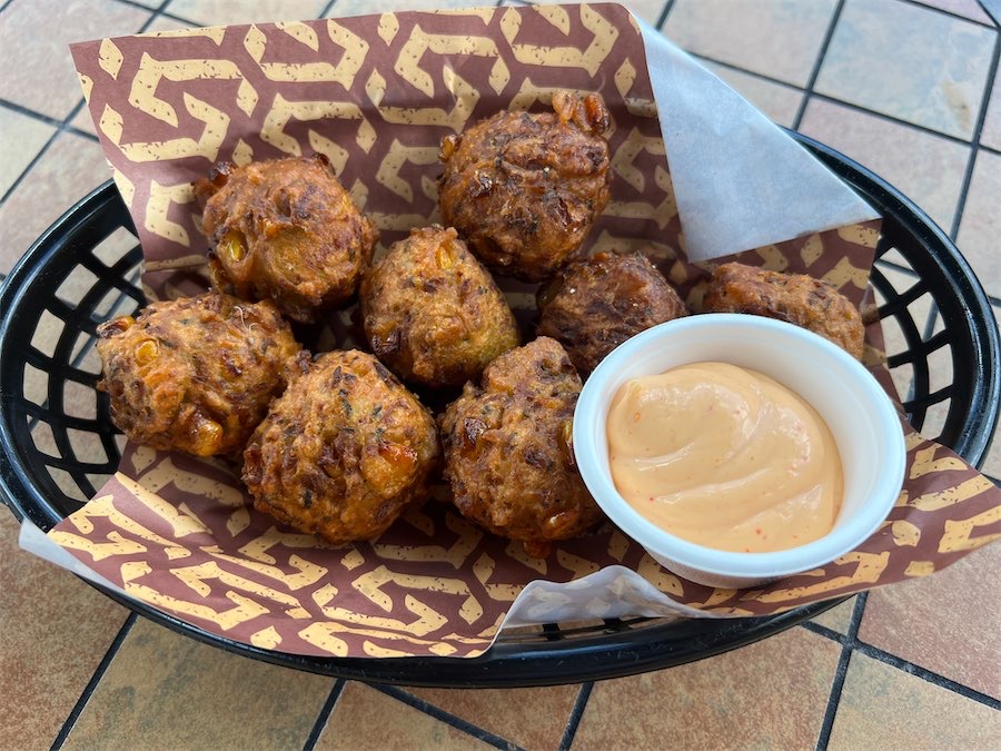 We shared the fritter bites, great value at $8 for a small serving and $12 for a large. These mini morsels are super tasty, and whole kernels of yellow corn are mixed in with zucchini.