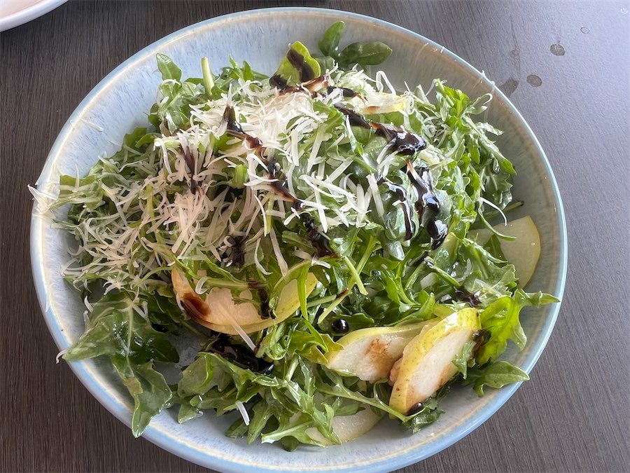 We shared a delightful and fresh rocket and pear salad, enjoying the lovely bite of the parmesan and a well-made balsamic reduction ($14).