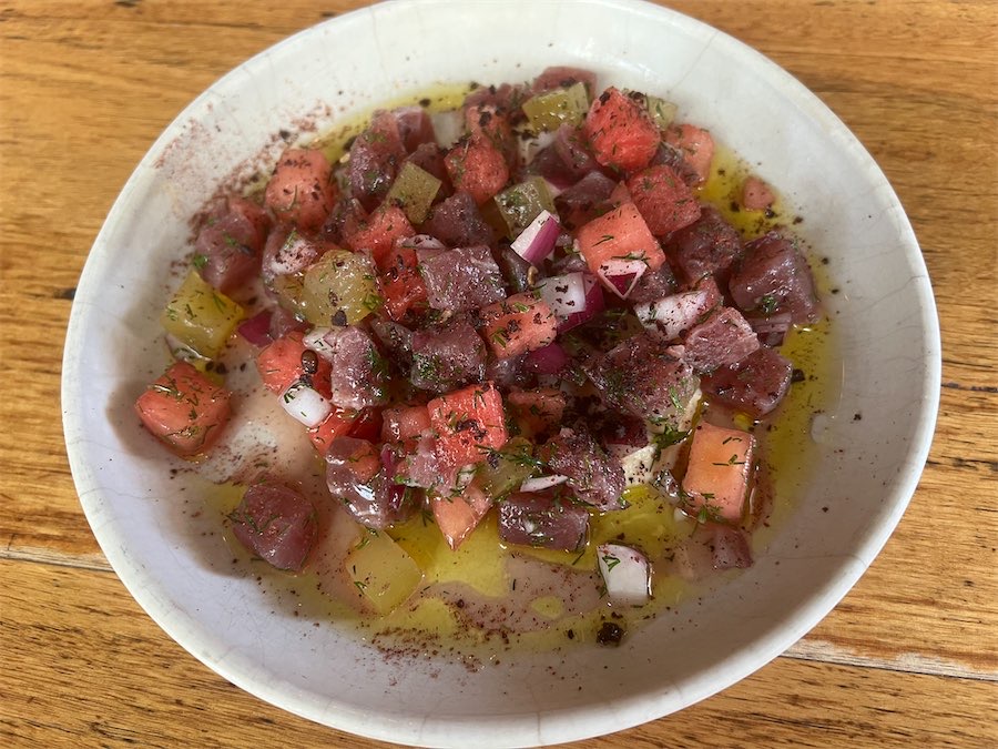Colourful and refreshing was the yellowfin tuna and refreshing ripe watermelon, all meticulously cubed. These ingredients were artfully placed on top of whipped feta and sprinkled with small pieces of red onion.