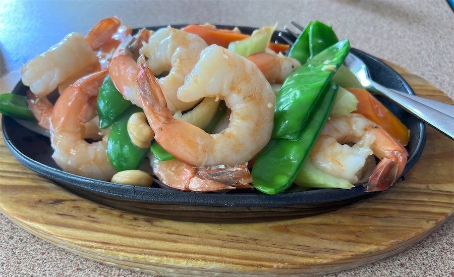 Prawn lovers won’t go wrong with the sizzling garlic variety, with delightful, crunchy snow peas and rich, nutty cashews for additional texture ($36).