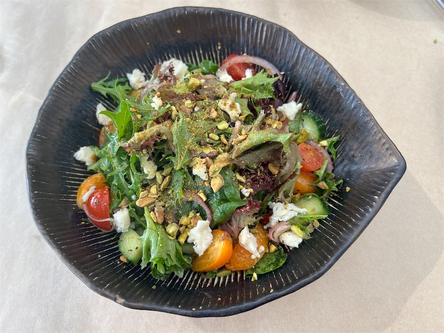 To cut through we ordered a mixed-leaf salad with mandarin, tomatoes, red onion, cucumbers gorgonzola and pistachio crumbs ($15). It looked a bit overwhelming, but the flavours worked wonders together.