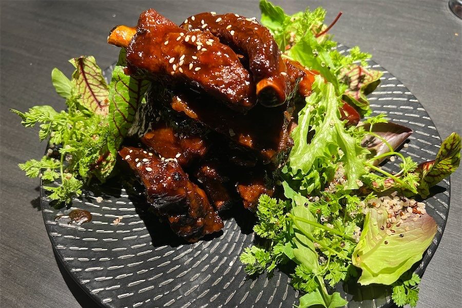 Muk Bar’s dinner menu is compact with four mains. The pork ribs were sticky and finger-licking good. They were tender, meaty and smothered in a glaze of house-made signature sauce – sweet, smoky and balanced with a Korean kick ($55). The kick is more about bold flavours than hot and spicy ones.